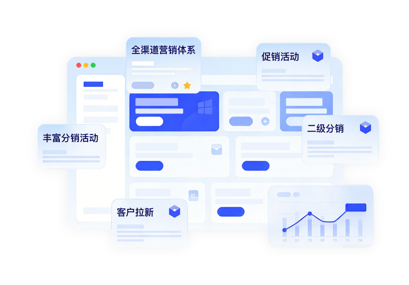 构建全渠道营销体系,提供丰富的分销活动,支持促销活动与二级分销,实现精准的客户拉新与留存